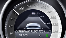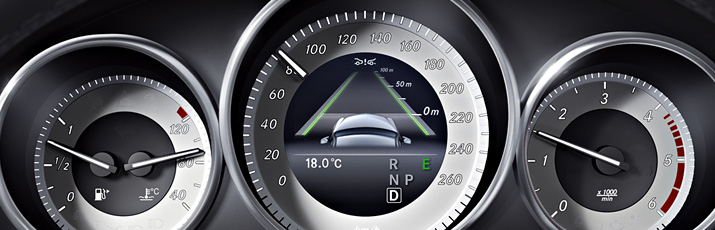 DISTRONIC PLUS proximity control helps the driver to maintain a specified (timed) distance from the vehicle ahead when travelling at speeds of 0 to 200 km/h. Thanks to the new Steering Assist feature, the system helps the driver to stay in lane by taking its bearings, in the first instance, from the road markings and additionally, at low speed, from the vehicle in front. Implementing BAS PLUS Brake Assist in conjunction with the PRE-SAFE® brake system helps to avoid rear-end collisions more effectively. If radar sensors identify a potential collision and the driver applies the brakes, BAS PLUS is primed to apply a brake force commensurate to the situation and available stopping distance. In the new E-Class the BAS PLUS function has been expanded to include for the first time crossing objects and pedestrians, something that is particularly relevant at intersections.