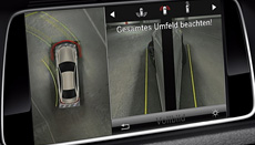 The Parking package helps the driver in tight parking and manoeuvring situations and comes with an innovation: A 360-degree camera system displays the vehicle's surroundings from a bird's-eye perspective on the screen of the COMAND Online multimedia system. Monitoring all four sides of the vehicle makes it easier to judge all manoeuvring situations. It can warn drivers visually and audibly of obstacles in front of and behind the vehicle, helping to prevent damage when manoeuvring. This includes: Active Parking Assist Active Parking Assist uses six ultrasonic sensors in the front bumper and six in the rear bumper to identify suitable parking spaces when the vehicle is travelling at speeds between 0 and 35 km/h. The automatic parking space search function is indicated by a "P" symbol in the instrument cluster. If Active Parking Assist has found a parking space, an arrow appears next to the "P". By default, Active Parking Assist searches for parking spaces on the right-hand side of the road. If the indicator on the driver's side is active, parking spaces on the left-hand side are also detected The driver starts the parking manoeuvring process by stopping ahead of the indicated parking space, selecting reverse and confirming the prompt which appears in the instrument cluster. Active Parking Assist steers up to a speed of 10 km/h. The driver only operates the accelerator and the brake pedal. The parking manoeuvre is completed in a maximum of 5 moves. The final parking move is indicated by the message "Parking Assist complete" in the display. This message is accompanied by an acoustic signal.< For the first time the E-Class furthermore offers the functions automatic parking and leaving a parking space with active steering and brake intervention as well as an additional lateral protection against obstacles located to the sides. PARKTRONIC: The system gives visible and audible signals to warn of obstacles it detects in front of the vehicle and behind. It is active up to a speed of about 18 km/h. | |