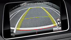 The reversing camera offers convenience and added safety. Integrated into the boot lid, the camera transmits an image of the area behind the vehicle to the central COMAND Online multimedia system (optional extra). The camera image not only makes parking easier but also aids in manoeuvring on terrain with visibility restrictions. New optics with digital image transfer and additional electronic zoom functions ensure an optimum image in all driving situations. When manoeuvring, the driver can select the "back-in" mode, in which dynamic guide lines indicate the respective path of the vehicle. | |