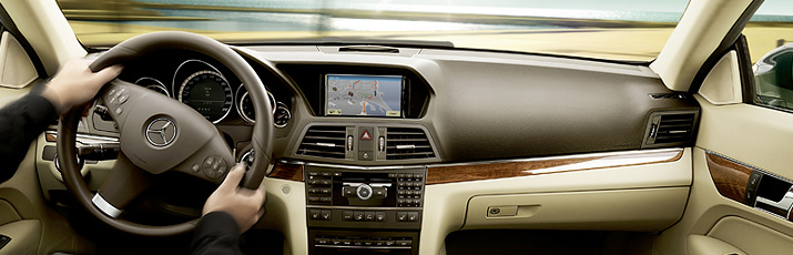 The interior of the new E-Class Coupé is a compelling proposition, offering contours and mobility offered by few Coupés in this class. The materials used are of a high quality and with an outstanding finish. With the choice between the ELEGANCE and AVANTGARDE interior concepts, you can opt for an elegant tone-in-tone design or a sporty contrast-tone look. The trim elements are in brushed aluminium as standard; fine wood is also available as an option – for ELEGANCE in burr walnut and brown pine, and for AVANTGARDE in black ash. The glass panoramic sliding sunroof with electric roller sunblinds creates an additional sense of space. Available as an optional extra, it extends to the rear of the vehicle.