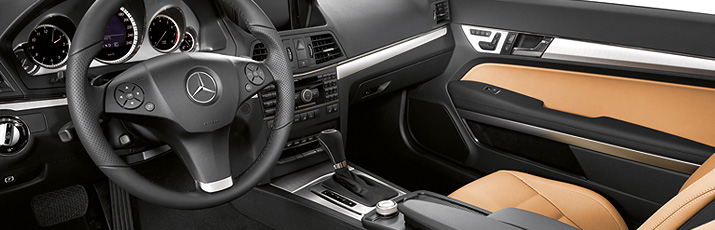 If you want to emphasise the sporty side of your new E-Class Coupé, you can opt for the AVANTGARDE interior concept: with black as the base colour, black A-pillars and C-pillars plus a black roof liner and instrument cluster with a silver-coloured backplate. For the seats, the door centre panels and the rear side elements there are five choices available for selection: the standard-fit fabric/ARTICO man-made leather combination in black, or for the optional leather a choice between black, alpaca grey, almond beige, flamenco red and natural beige and the optional appointments of black nappa leather, alpaca grey and almond beige. The trim parts are also optionally available in black ash.