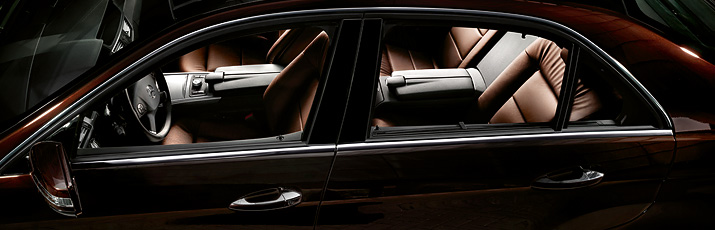 The AIRMATIC air suspension – standard in the E 500 and optional for the 6-cylinder models – automatically influences the effect of the shock absorbers on each wheel and adapts them to the current road, load and driving characteristics. The driver can manually switch between a comfortable and a sporty setting. When necessary the system independently switches to a more rigid option – for example when the driver has to make an evasive manoeuvre. The vehicle height can be regulated with a push of a button: on poor sections of the road the vehicle height can be raised by 25 millimetres and at higher speeds it is automatically lowered by 15 millimetres – for more driving stability and less air resistance. Even when the vehicle is loaded the ground clearance remains constant thanks to the level control system.